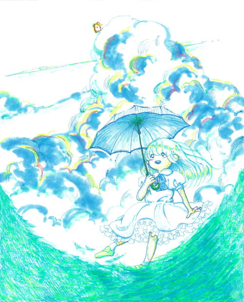 入道雲や暑さなど、真夏には、人を幻惑する要素があるように思います。詩を読んで、“どこかに幻惑感をともなう夏らしさ”を感じとってもらえたならば、幸いです。一方、夏の日に対する思いや印象は人それぞれ。イラストは、詩の世界をとてもさわやかな印象でとらえ、表現してくれました。