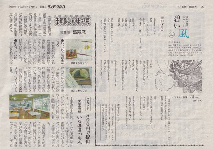 山形県天童市を中心に発刊されているタウン紙「サンデータイムス」(キンダイ通信社発行、月刊紙、フリーペーパー)の紙面に、2017年(平成29年)5月号から2019年(平成31年)2月号まで、「碧い風」というコーナーを設けていただき、季節感を表す詩を連載させていただきました(2019年1月号には休載で、計21回)。