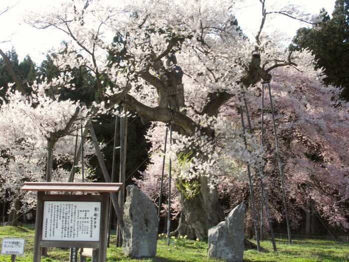 山形県の南部、置賜地方には、長井市や白鷹町を中心に、樹齢が500年を超えるとされる桜の古木があちこちにあって、「置賜さくら回廊」と呼ばれています。写真の桜は、どれも白鷹町のものですが、長井市にも、「伊佐沢の久保桜」や「草岡の大明神桜」などがあり、その二つの桜は、ともに国指定の天然記念物です。