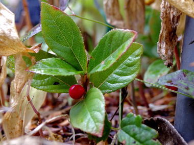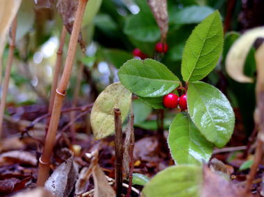 「ジュウリョウ」は、「ヤブコウジ」のことで、「センリョウ」や「マンリョウ」と同様に、正月をはさむ寒い時期に赤い実を付けます。大きくはならず、実の付き方が、写真のようにわずかなので、「センリョウ」や「マンリョウ」に対して「ジュウリョウ」なのだろう、と思います。