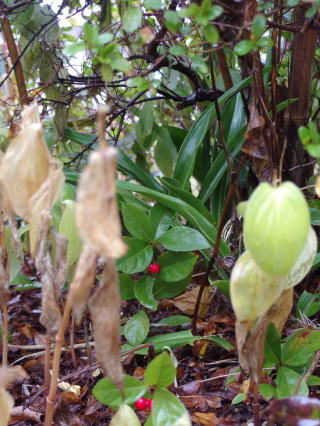 「なぜ、こんな場所に生えているのだろう。」と不思議に思われましたが、「ヤブコウジ」は日陰を好む植物であり、しかも、ツツジの株の下というのは、考えてみると、雪が積もっても、ツツジのおかげで雪の重さを直接に受けずにすむ、その点で雪をしのぎやすい場所なのだろう、と考えられます。