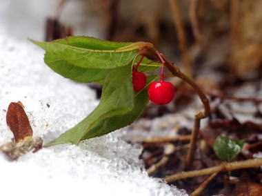 次の写真は、二つとも、2月6日に撮影したものですが、一時期雪が深く積もったあとにも、このように「ヤブコウジ」が実を付けていました。