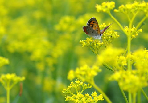 8月23日に、山形市野草園で撮影しました。黄色い花は、秋の七草のひとつ、オミナエシです。チョウは、ベニシジミ。