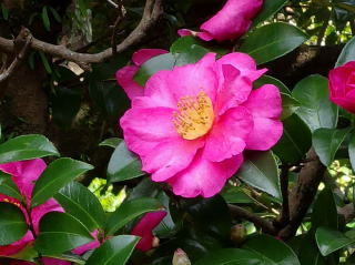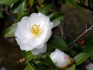 山形県でも、生け垣などに、サザンカの花が咲いているのを見ることができますが、山形では“寒いのによく頑張って咲いているなあ”と、けなげさを感じるのに対して、京都のサザンカは、“ゆうゆうと、自然と咲いている”と感じさせるものでした。花自体が、山形で見るものより大ぶりに思われたのは、種類が違うのか、気候のせいなのか、単なる気のせいなのか……。とにかく、サザンカも、常緑広葉の木です。