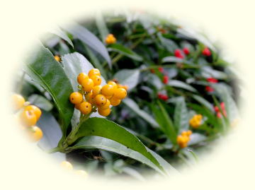 正月の縁起物として知られるセンリョウが、あたかも自生しているかのように(自生ではないのではないかと思いますが)、生えて実をつけているようすが、印象に残りました。黄色い実をつけるセンリョウ(キミノセンリョウ)は、初めて見ました。
