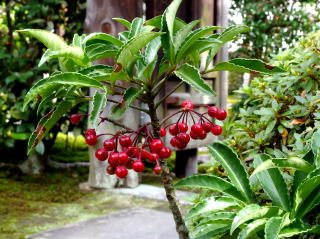 即宗院の境内には、次の写真のように、「マンリョウ(万両)」もありました。葉の上に実をつけるのがセンリョウで、葉の下にたくさん実をつけるがマンリョウ、のようです(ちなみに、「カラタチバナ」を「ヒャクリョウ(百両)」と言い、「ヤブコウジ」を「ジュウリョウ(十両)」と言うようです。どれも、正月をはさむ寒い時期に赤い実をつける植物ですね)。