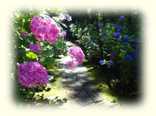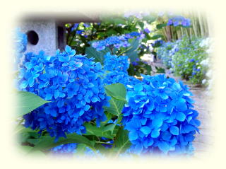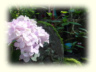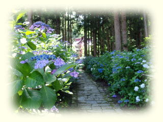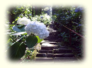 お堂にのぼる石段にそって、たくさんのあじさいがあり、さまざまな彩りを見せていました。